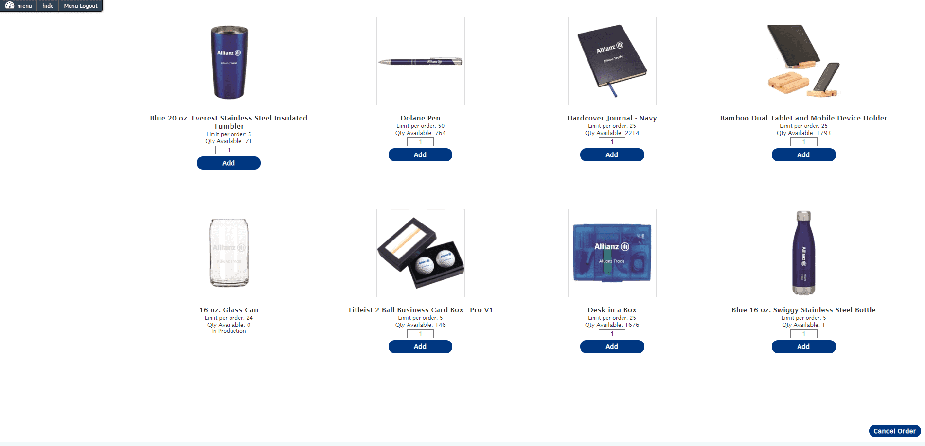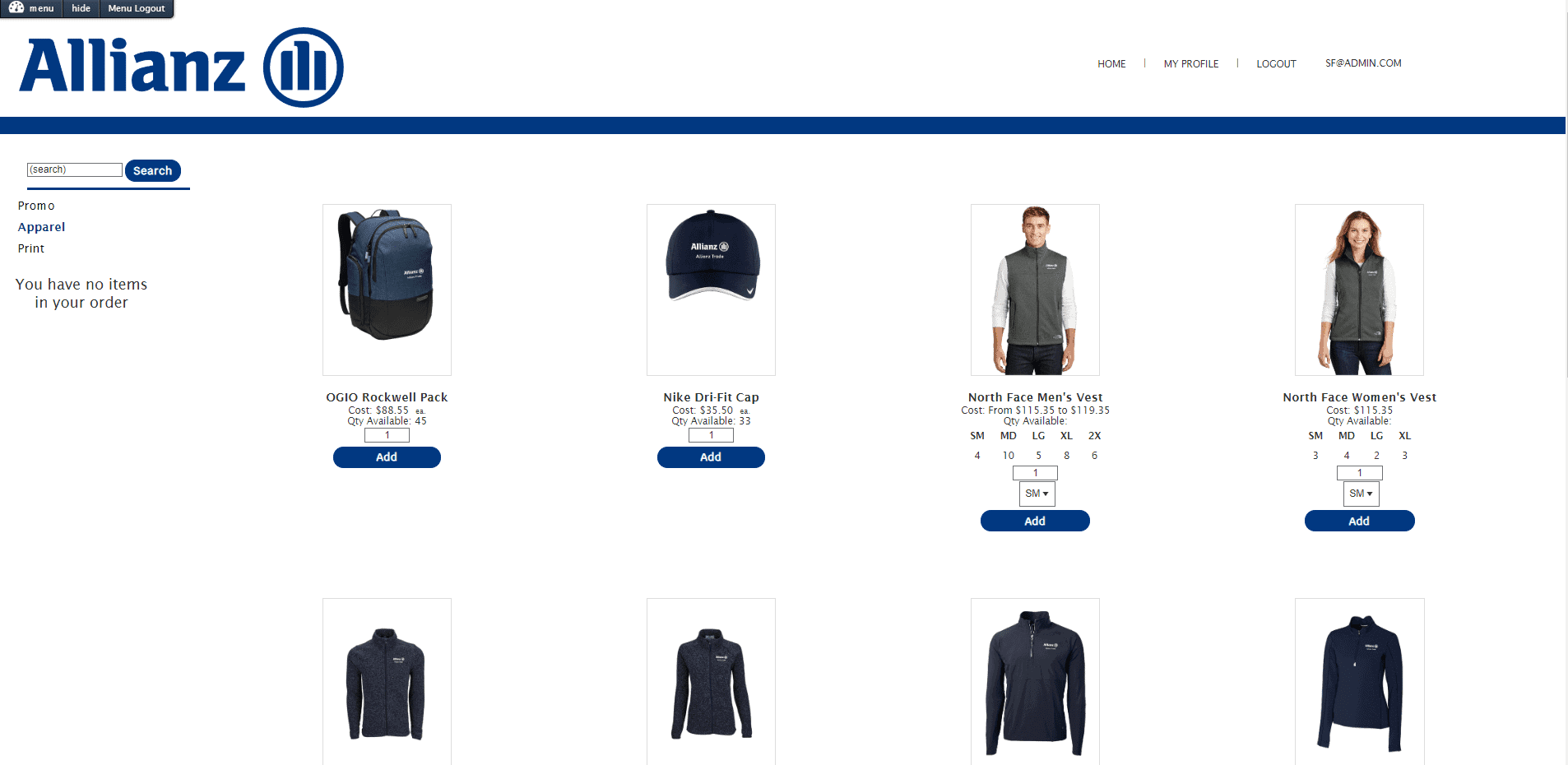 Allianz was presented with different apparel and proof options and provided quotes for their preferred selections. They expressed their desire for a company store, and after quote approval, the project moved into the proofing stage with the need for the company store in mind. The promotional items and apparel were proofed at the same time and moved into production right after they were approved. Allianz then selected the embroidery they wanted for the polo shirts and looked at different decorating techniques that were presented for the promotional items, selecting their preferred options. Some items were delivered immediately while others were held back to account for the company store they would be using. When orders were placed, larger quantities were ordered so that they could start off with plenty of inventory to get their store up and running. Right away, they had a trade show they needed to prepare for. They were able to pull the items they needed for their trade show, and could immediately see what they had remaining on hand, offering a seamless way to manage their inventory without having to dedicate the space to their bulk materials.